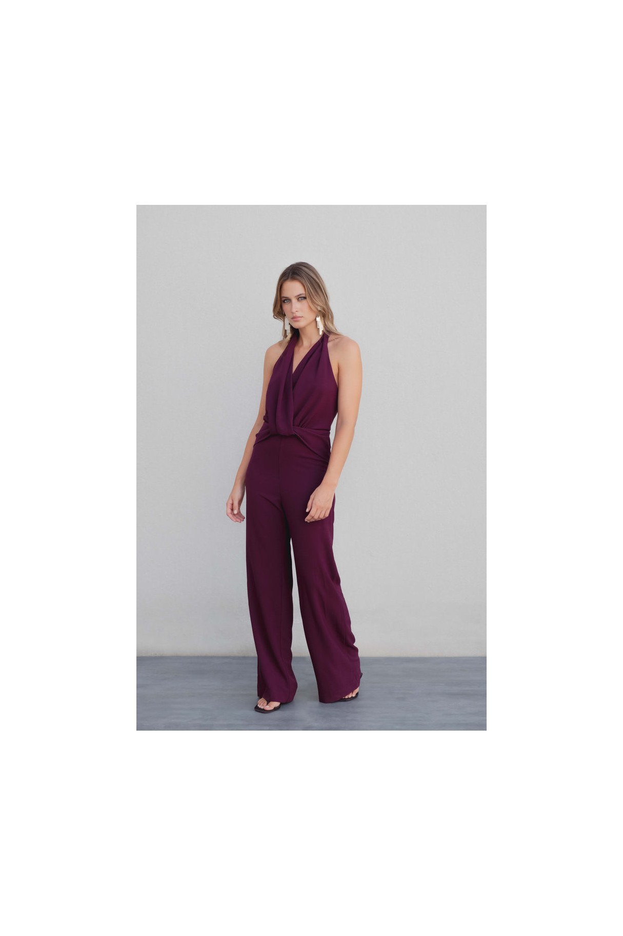 Su escote pico y espalda descubierta realzan la figura con un toque elegante y moderno. Con pernera ancha que estiliza y aporta movimiento, y un cierre trasero con cremallera oculta y botones en el cuello para un acabado impecable.