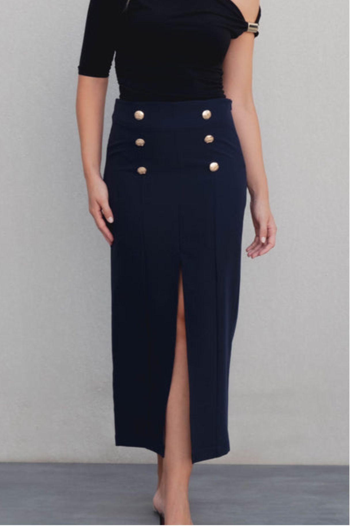 Elegancia y estilo se combinan en esta falda midi con botones, diseñada con tiro alto para realzar la silueta. Presenta un delicado bajo con abertura en el delantero que aporta movimiento y feminidad, además de un cierre trasero con cremallera invisible que garantiza un acabado impecable. Una prenda versátil y sofisticada, ideal para looks de oficina o para elevar tus conjuntos de día a noche.