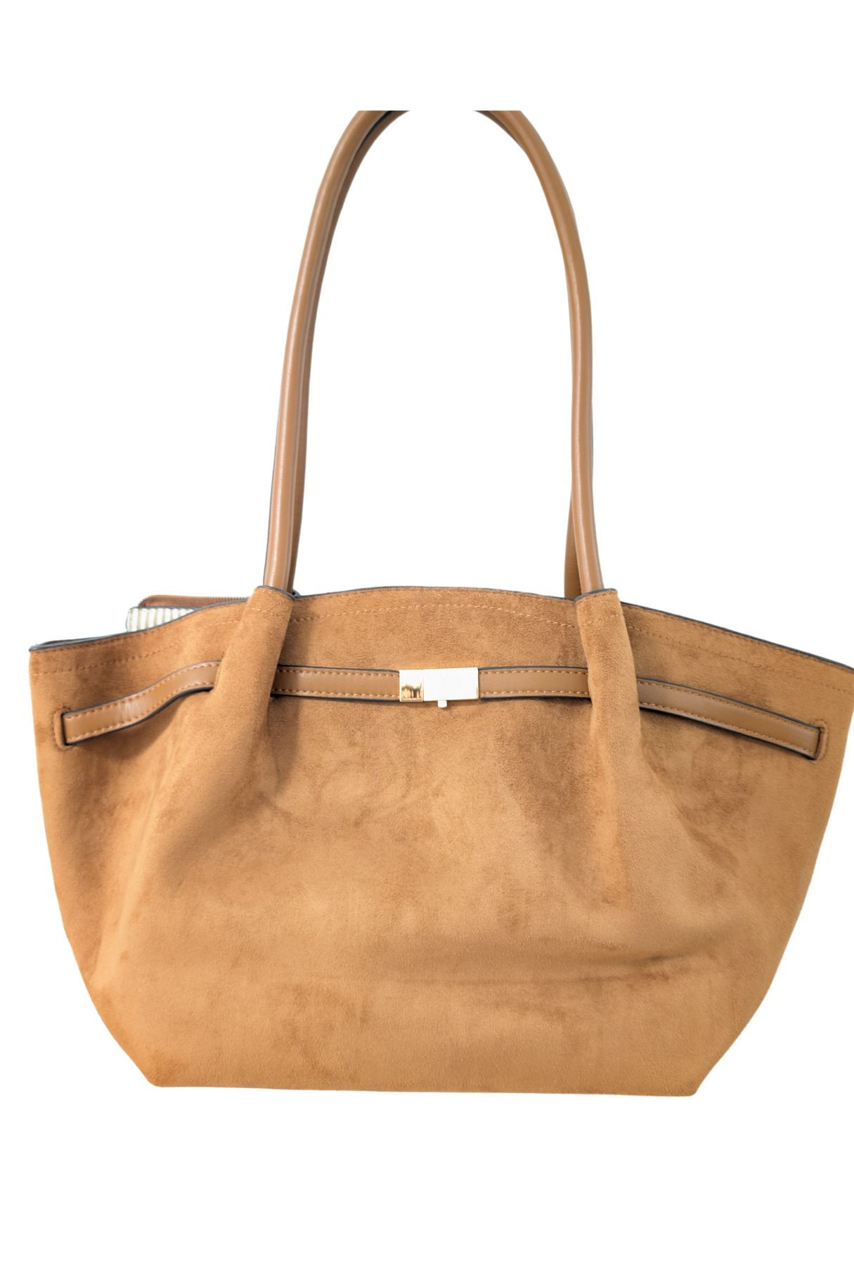 Bolso maxi confeccionado efecto ante, de color marrón, con un diseño elegante y atemporal. Su correa ancha permite llevarlo cómodamente al hombro o en la mano, adaptándose a cualquier ocasión. Dispone de cierre con cremallera para mayor seguridad y un interior amplio ideal para el día a día.